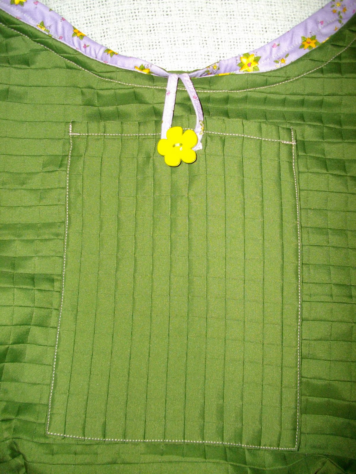 This was for my mom's birthday. It was made out of a gauzy, embroidered skirt I found at a thrift store and is accented with a yellow cotton lining and white and yellow flower button. Her favorite color is yellow and she's a gardener
